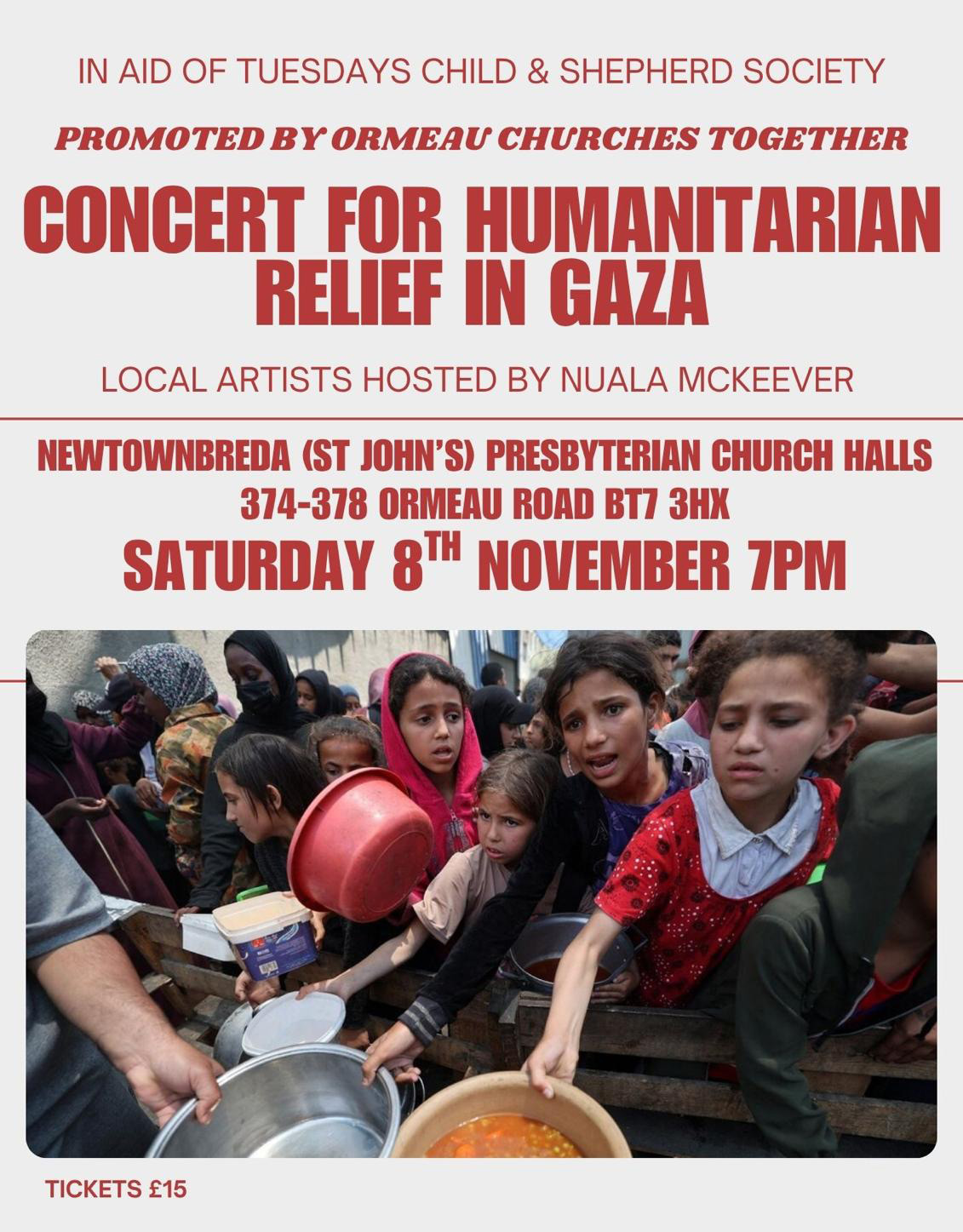 Ormeau Churches Together are kindly organising a concert for humanitarian relief in Gaza with part proceeds to Tuesday’s Child. Tickets £15.